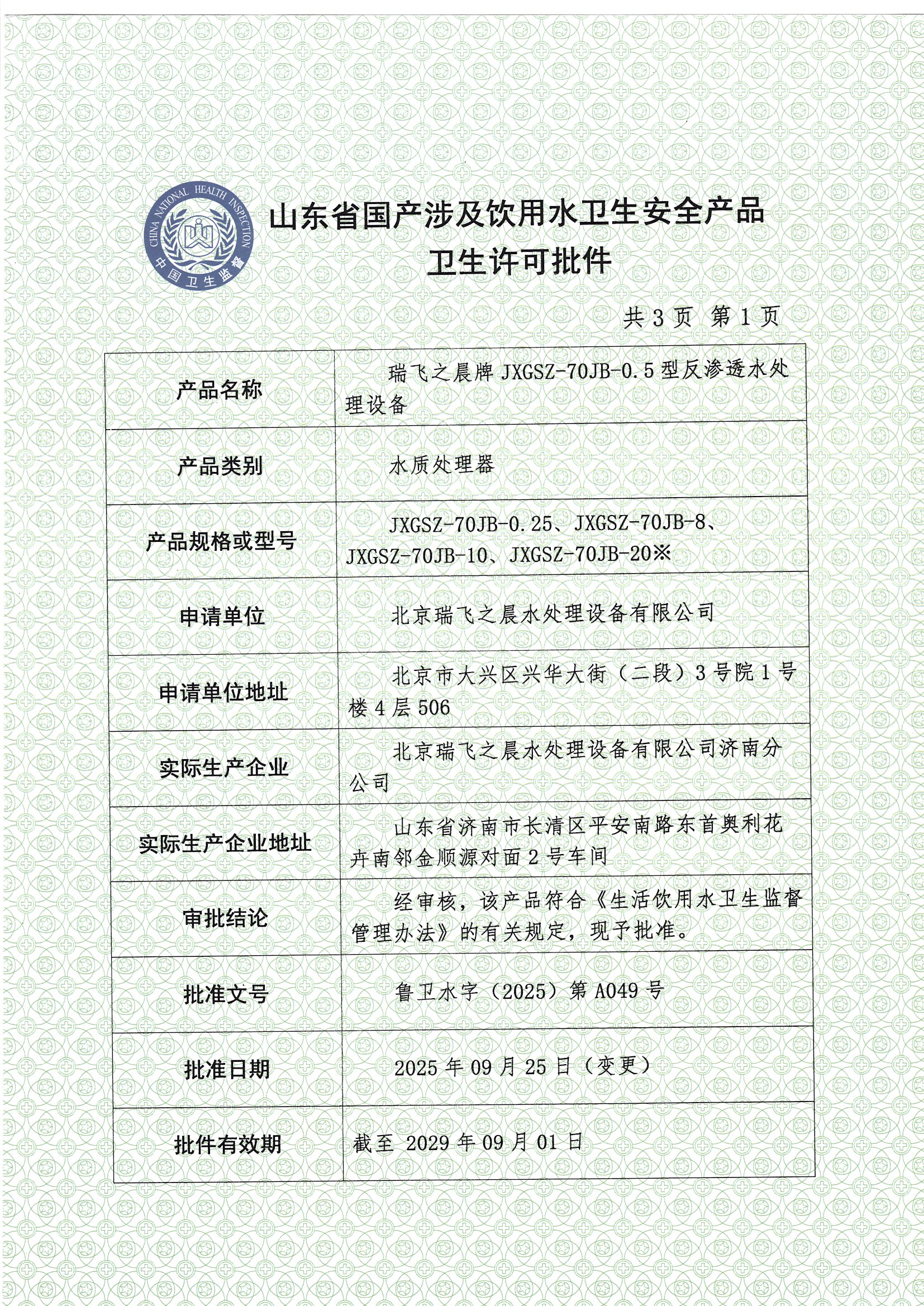 瑞飞之晨牌反渗透水处理设备涉水批件.jpg